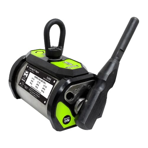 Mag-Mate lifters are designed with critical safety mechanisms, such as locking handles and safety latches, to prevent accidental deactivation. On models like the AdvantageLift™, the lifting bail itself mechanically locks the handle in the “ON” position as soon as tension is applied, ensuring the magnet cannot be switched off until the load is safely placed back on the ground and the tension is released.